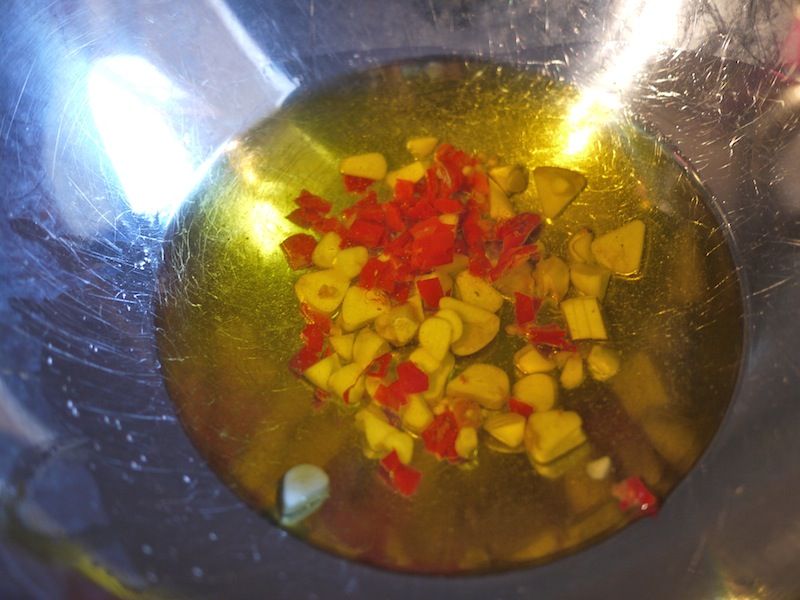 Nell’attesa preparate un battuto grossolano di aglio e peperoncino e mettetelo in un contenitore capiente; aggiungete l’olio di oliva, mescolate e lasciate riposare qualche minuto per far legare aromi e sapori.