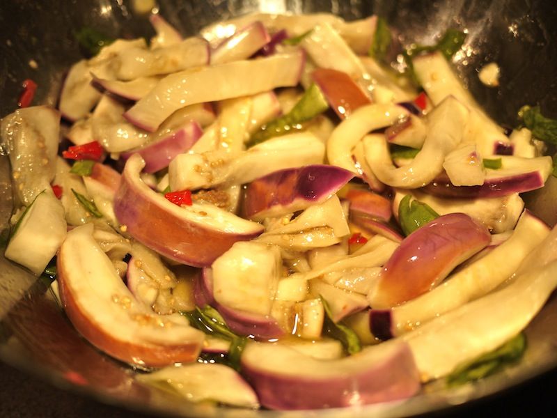 Aggiungete le melanzane all’intingolo di olio e rimescolatele per bene per farle insaporire.