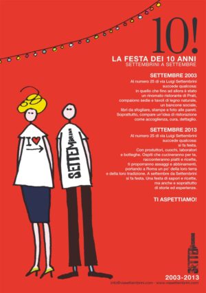 Dal 2003 al 2013 tante cose sono cambiate nel locale di Prati che porta il cognome dello scrittore e del patriota italiano dell'800. Innanzitutto la sua fisionomia: oggi non è solo ristorante, ma anche bistrot, libreria e birreria. E per festeggiare Settembrini vuole tornare alle "origini" e alla genuinità della cucina. Per questo ha selezionato dieci regioni e per ognuna ha invitato produttori, cuochi, laboratori e botteghe che oggi in Italia legano il loro nome alla qualità e alla ricerca, per uno scambio di storie e piatti della tradizione.