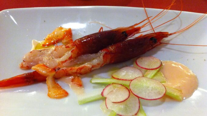 Vado con ordine: crudo di gamberi con maionese di fragole. Ogni piatto all’ultimo grido che si rispetti è inspiegabilmente accostato alla frutta. (Sì, però ci sta bene!)