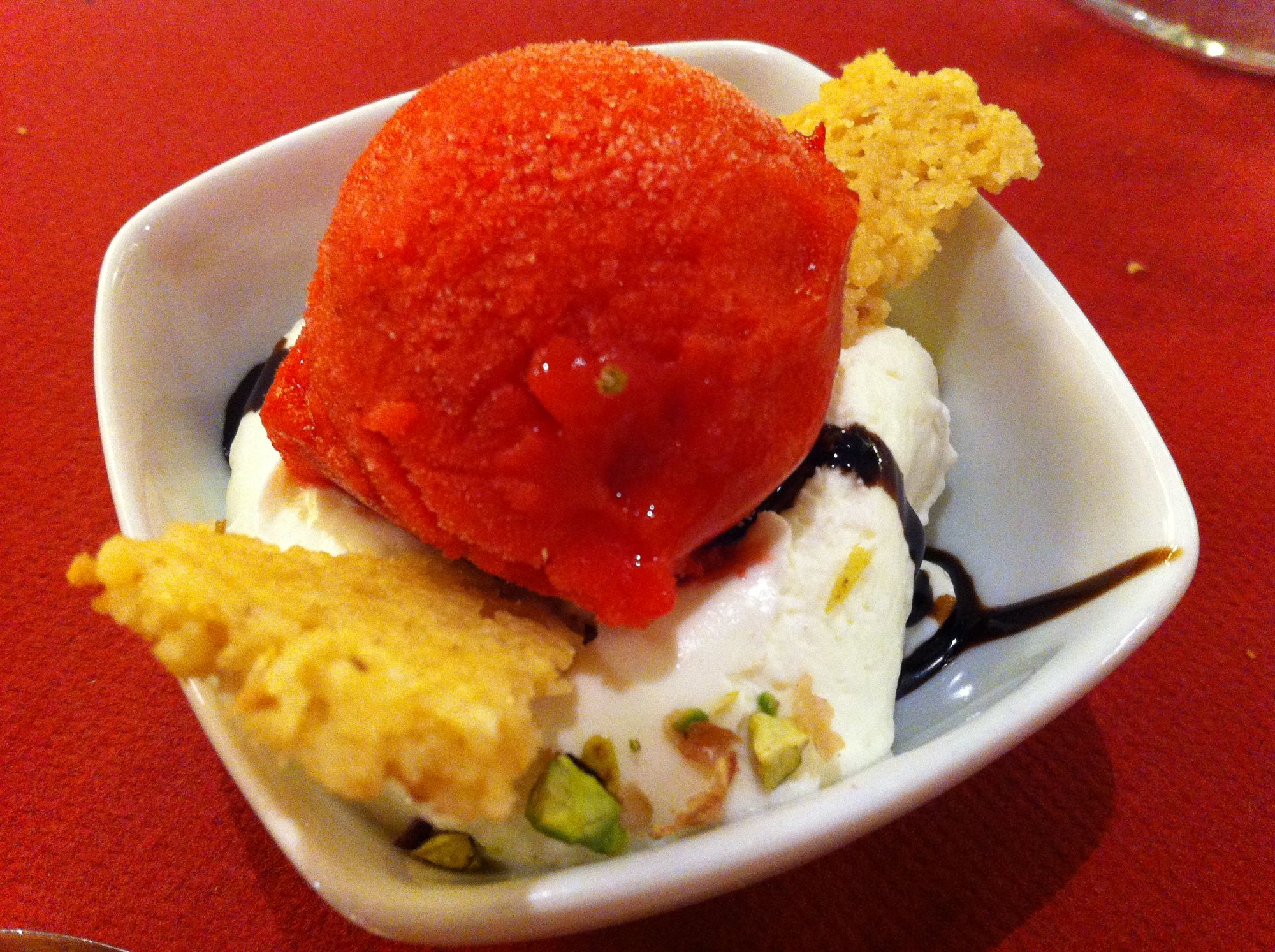 Saremmo per saltare il dolce quest'oggi, già provati dalla luculliana degustazione, ma vinciamo le resistenze quando adocchiamo la mezza porzione di gelato alla fragola, vellutata di yogurt, cialde al pistacchio e riduzione di aceto balsamico che ci offrono gentilmente come dessert.