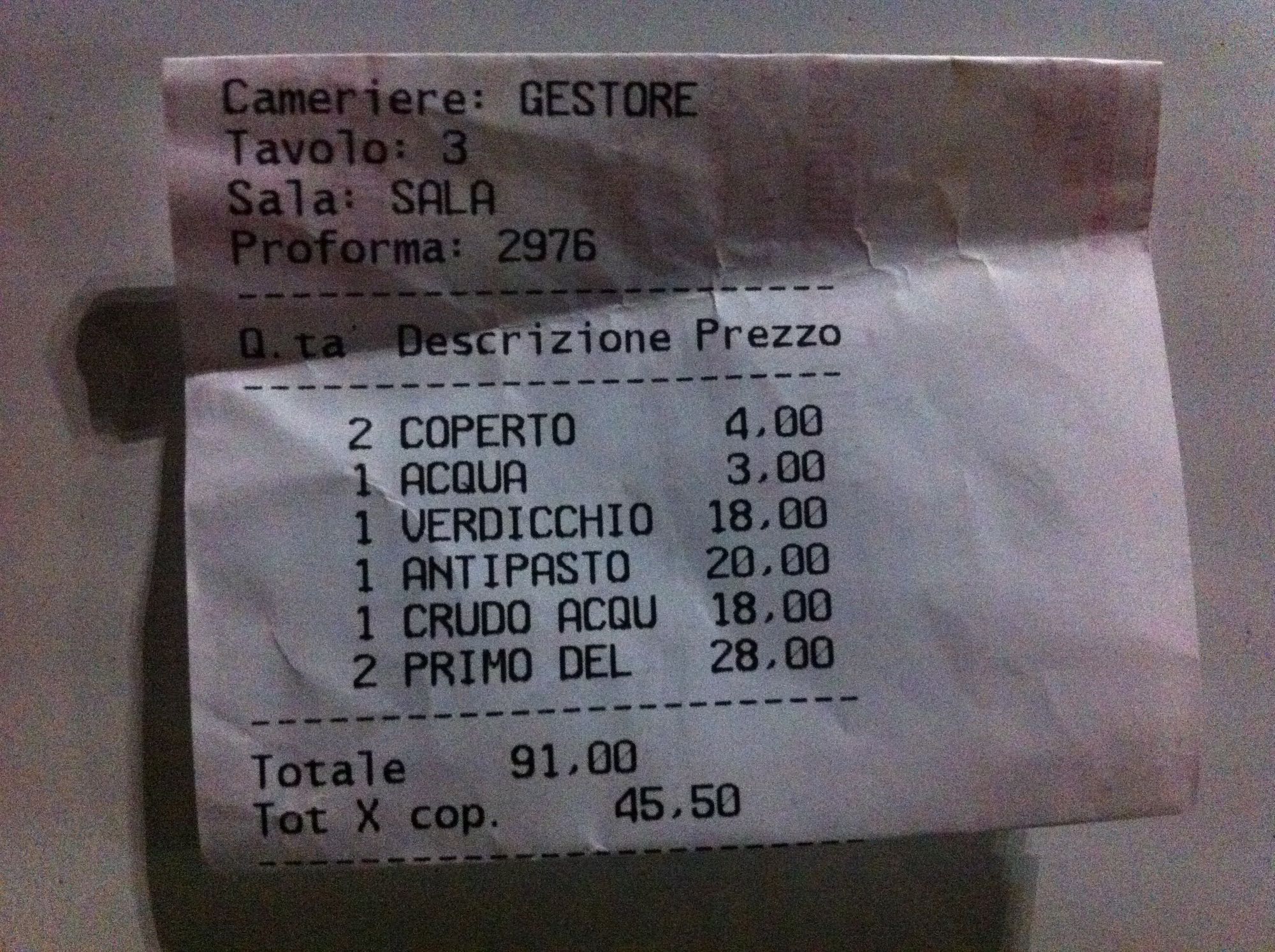 Usciamo dal ristorante rotolando. Per non fare la nostra stessa fine, vi informo che è possibile fare anche un aperitivo a cinque euro con due ostriche e un calice di vino o prosecco. A diciotto euro invece è previsto un aperitivo rinforzato, che al calice prevede un piatto di crudi secondo disponibilità del giorno. Siete avvertiti.