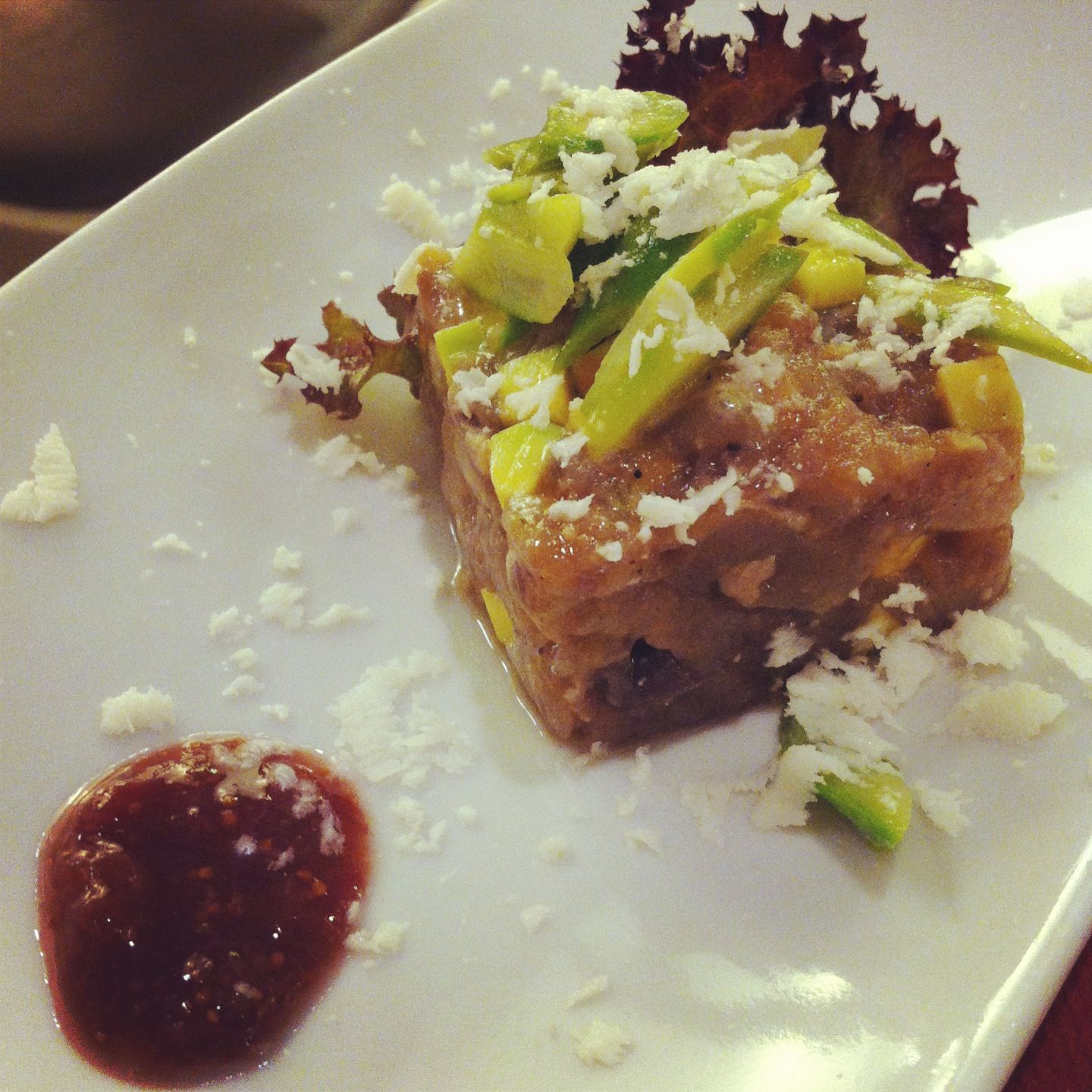Tartare di pesce Serra (l’ho già chiesto per voi, è un pesce azzurro) con avocado, asparagi, gelato al pecorino e riduzione di fichi. Esagerati. Ma decisamente il mio preferito. Mille sapori ben accostati.