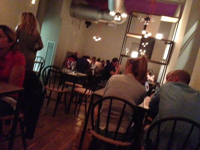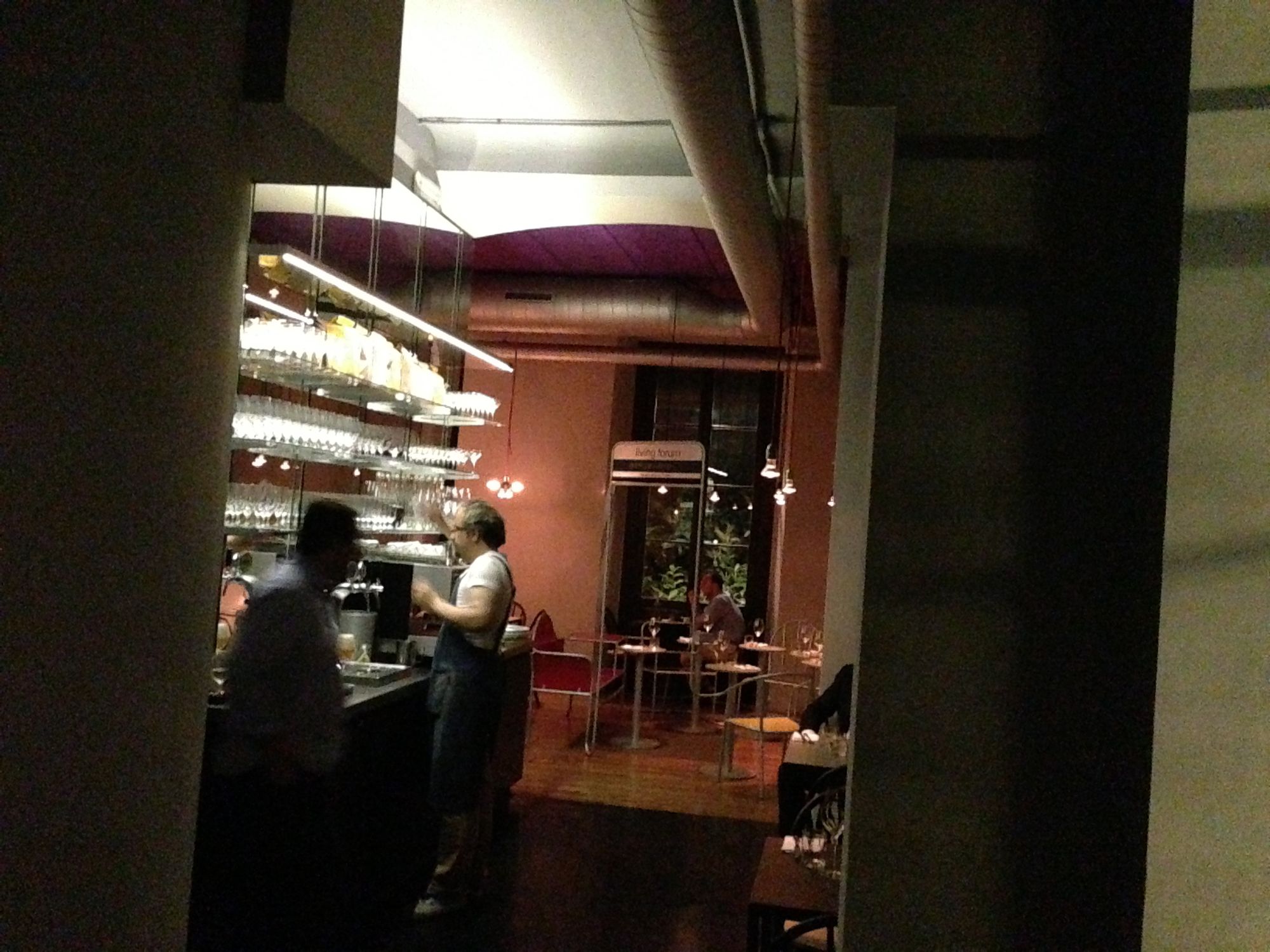 Della luce fioca, ha già detto benissimo qui l'ottimo Valerio Visintin. E del resto, senza leggerlo, abbiamo accennato scherzosamente ai camerieri che per leggere il menu ci serviva un ITorch e i musi di risposta hanno chiarito che si tratta di dato sensibile e che forse il pezzo di Visintin non è passato inosservato.