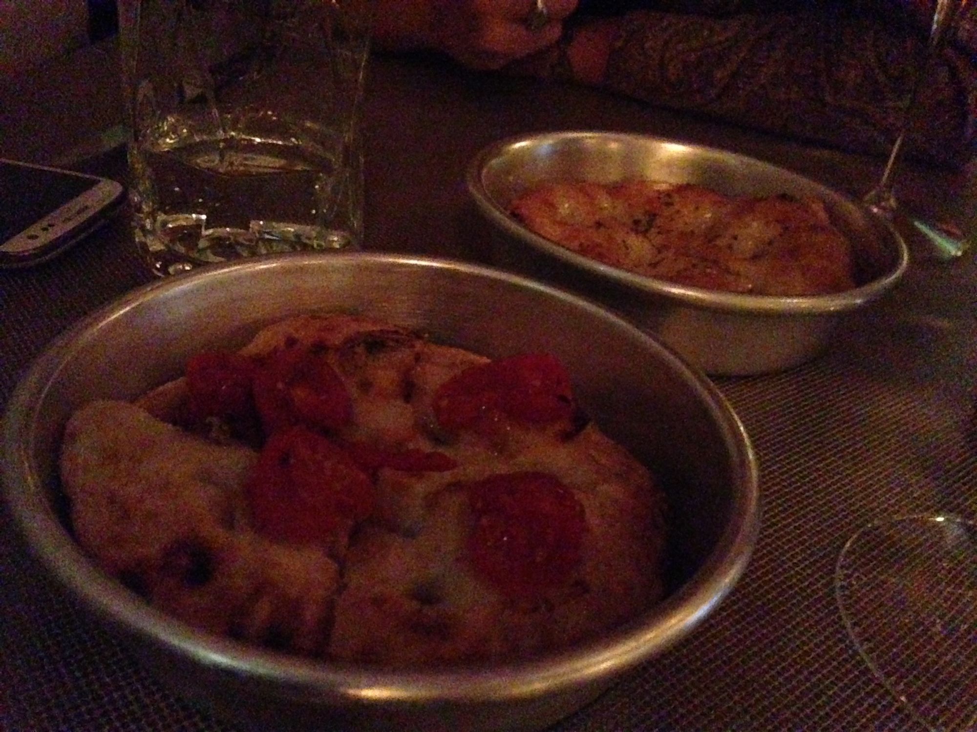 Ci facciamo portare subito due focacce: una con i datterini affumicati (6 euro), l'altra rosmarino e cristalli di sale (6 euro): semplicemente strepitosa, morbida, saporita, lievitata alla perfezione