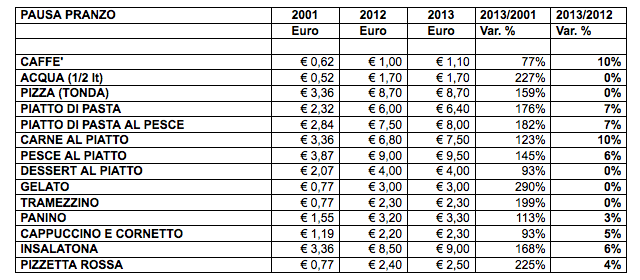 Un pasto tipo composto da acqua, un piatto di pasta, dessert e caffè consumato in una tavola calda o in un self service può arrivare a costare 13,20 euro al giorno, per un totale di 290,40 euro al mese, addirittura il 139% in più rispetto al 2001. Se infatti un piatto di pasta una decina di anni fa costava in media 2,32 euro, oggi ne costa 6,40. Dal 2001 costa più di tre volte tanto anche la bottiglietta da mezzo litro di acqua: da 52 centesimi a 1 euro e 70. Il dessert al piatto raddoppia: da 2,07 a 4 euro in poco più di 10 anni. E pure il caffè è passato da 62 centesimi di media a oltre 1 euro.