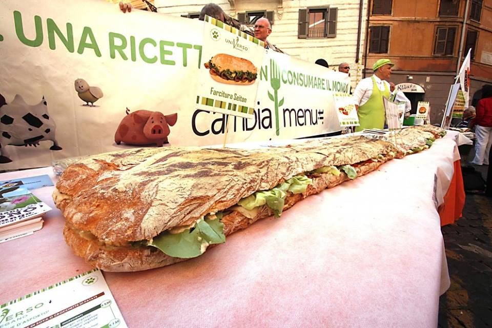 Un panino vegano da record, ben 4 metri e mezzo di lunghezza per 50 centimetri di larghezza, ha saziato la pancia dei romani – animalisti e vegetariani – che hanno festeggiato così l'altro ieri a Campo de' Fiori a Roma, la Giornata internazionale della nonviolenza in onore del Mahatma Gandhi e la Settimana vegetariana internazionale (che è proprio in corso, se non ve ne eravate accorti, fino al 7 ottobre).