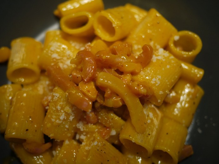 Per quelli che avessero appena fatto una smorfia di disappunto, ecco la ricetta della classica carbonara. Siete liberi di metterci la panna, la pancetta o persino lo speck, il parmigiano e non il pecorino, il bianco dell’uovo assieme al rosso, l’aglio, la cipolla: come detto, ognuno, in fondo, ha la sua carbonara. Noi abbiamo scelto la versione della rinomata pietanza firmata da Luciano Monosilio, del ristorante romano Pipero al Rex. La sua carbonara ha fatto parte di uno dei sette piatti del menu Identità London 2013, un super pranzo da Harrods, costato, a chi ha avuto la gioia di parteciparvi, la bellezza di 150 sterline a commensale.