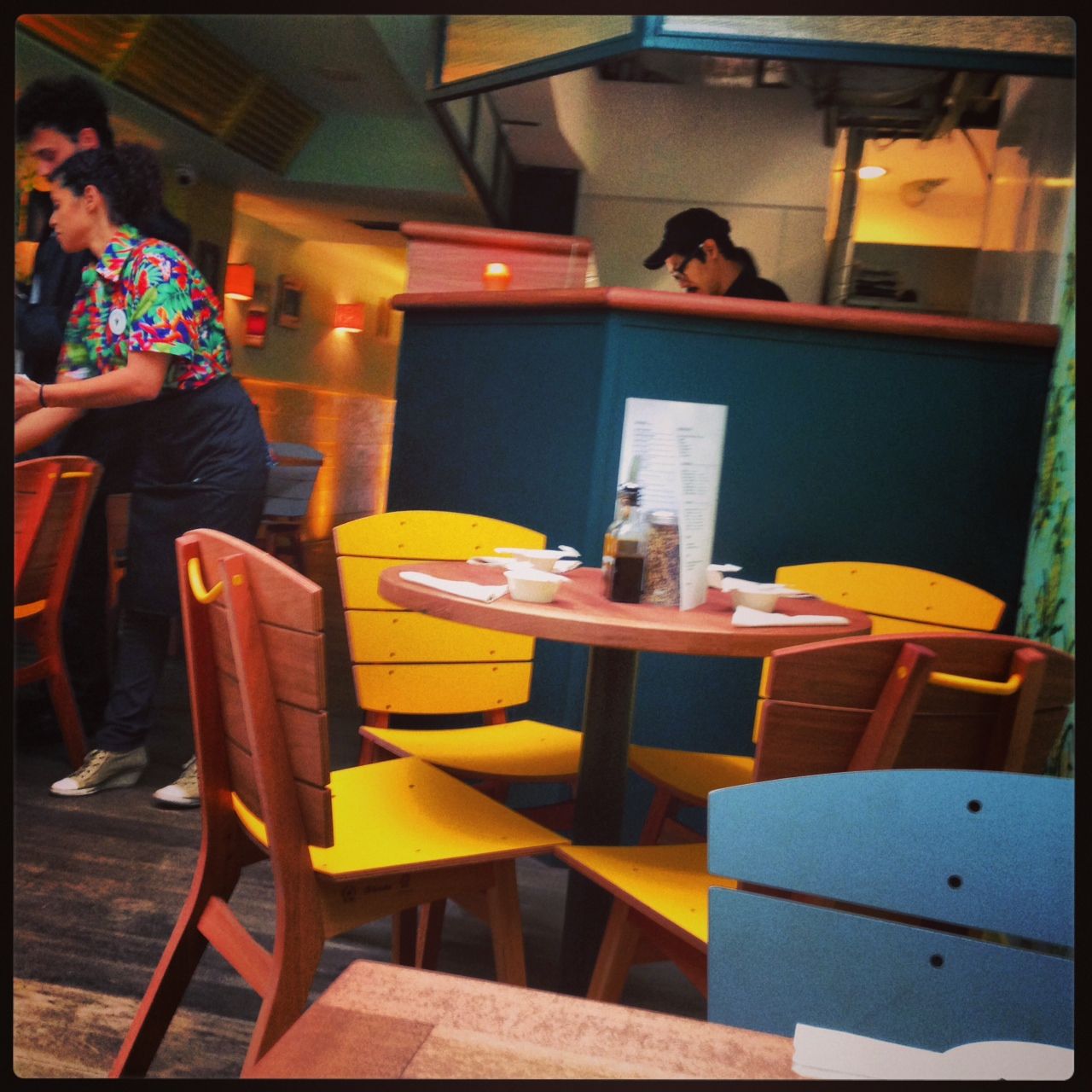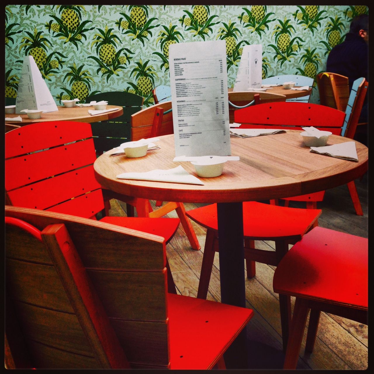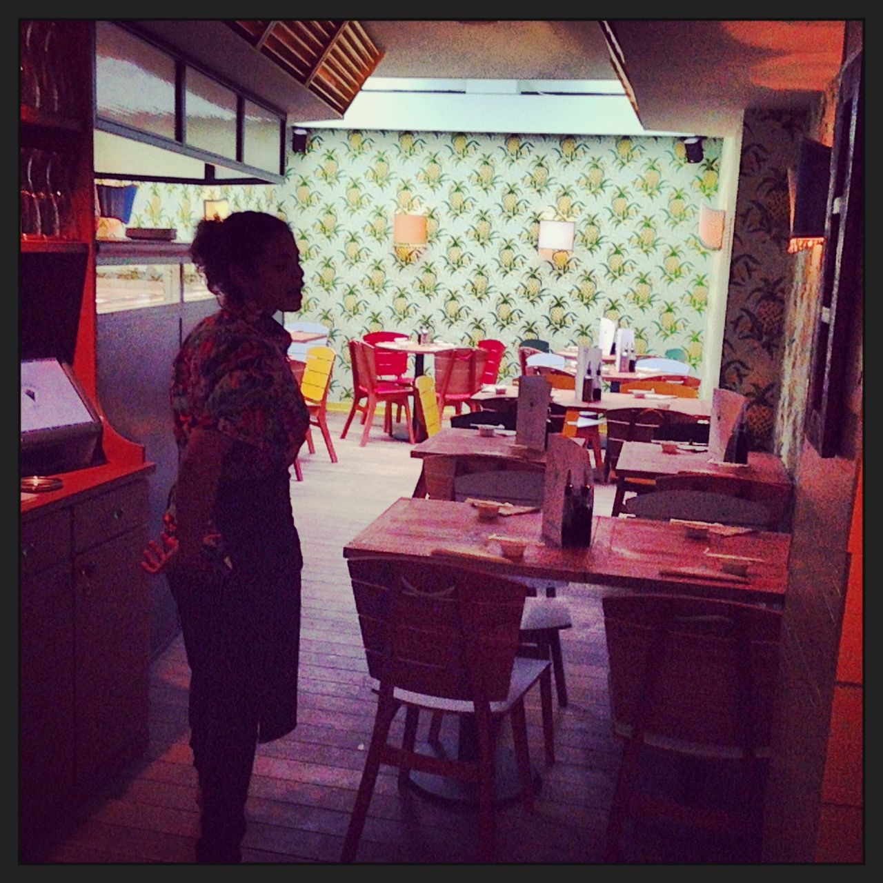 Grandi ananas alle pareti, gialle e verdi, sedie rosse e gialle, pavimento di legno, bel bancone a vista.
