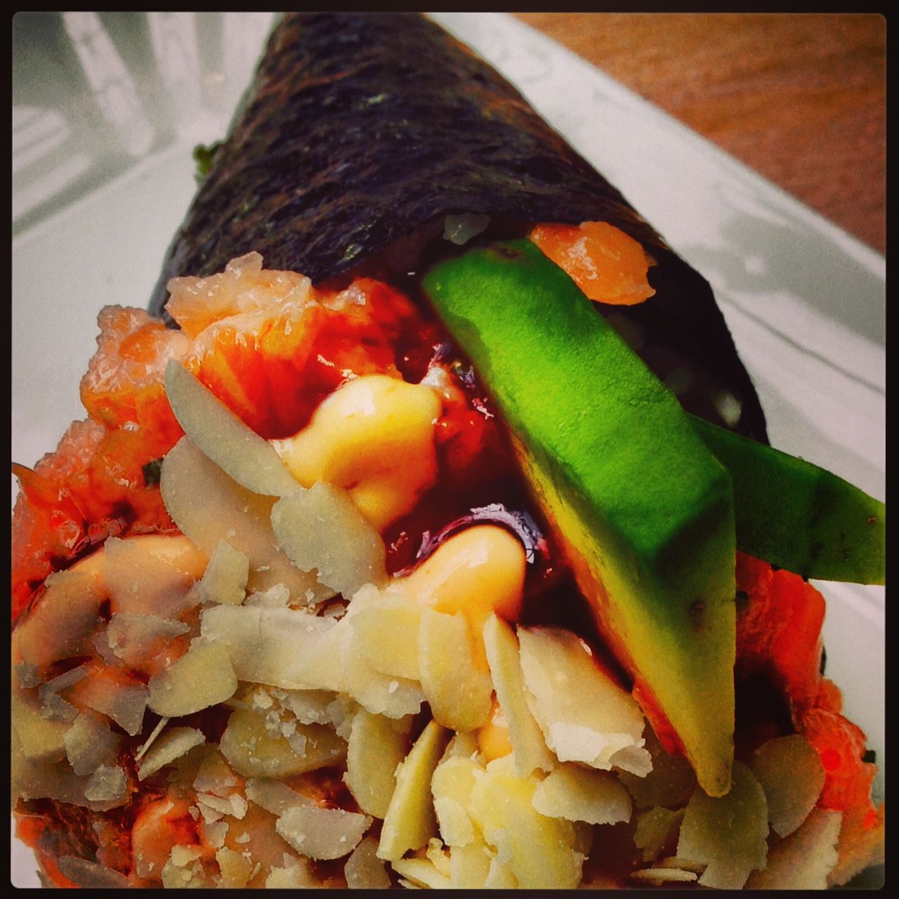 Ed ecco un temaki medio: questo è Salmão gostoso, ovvero tartare di salmone, avocado, philadelphia, eba cipollina, caviale di pesce volante e scaglie di mandorle. Si mangia rigorosamente con le mani, con o senza aggiunta di soia. Il risultato: una bomba di goduria (con relativo senso di colpa e dubbi da presunto gourmet).