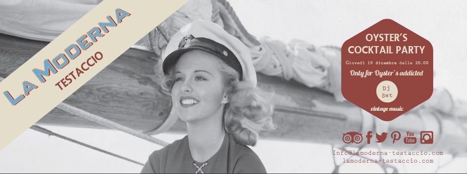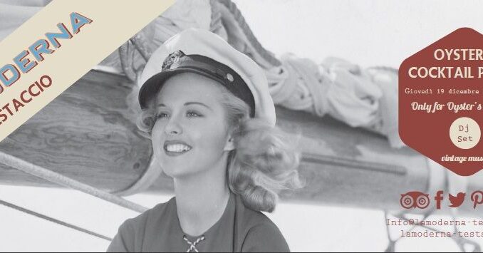 In vista del Natale a La Moderna di Testaccio aperitivo a base di ostriche pregiate Sublime, Speciales Divine, Mont Saint Michel, Creuses De Bretagne, e i cocktail in abbinamento studiati ad hoc dai barman del locale, "Tonico", "Salsa forte", "Tempi Moderni". In più dj set – Vintage Music Anni '60. Ecco i prezzi: Aperitivo, Cocktail e un'ostrica: 8 euro; Piatto con selezione di 3 ostriche: 10 euro; Piatto con selezione di 6 ostriche: 18 euro; Piatto con selezione di 12 ostriche: 30 euro. Menu aperitivo: Pizzottelle, Panzerottini Assortiti, Spiedini “Cani Caldi”, Peperoni Mongetto, Peperoni verdi e caprino, Cuori di carciofo, Cubetti di melanzana caponati, Crostini Assortiti.