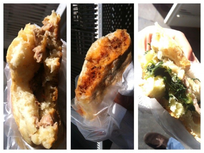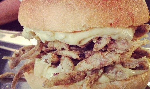 Eccolo il panino che ci piace di più di Tricolore, il forno pluripremiato del rione Monti che è rinato dopo un momento di appannamento e dopo il cambio della formula (via la scuola di cucina): pane al grano duro con lattarini (pescetti di lago) e salsa tartara. Se non vi soddisfano i pescetti, provate il pane di patate con guancia di Fassona cotta a bassa temperatura (e pepe e alloro).