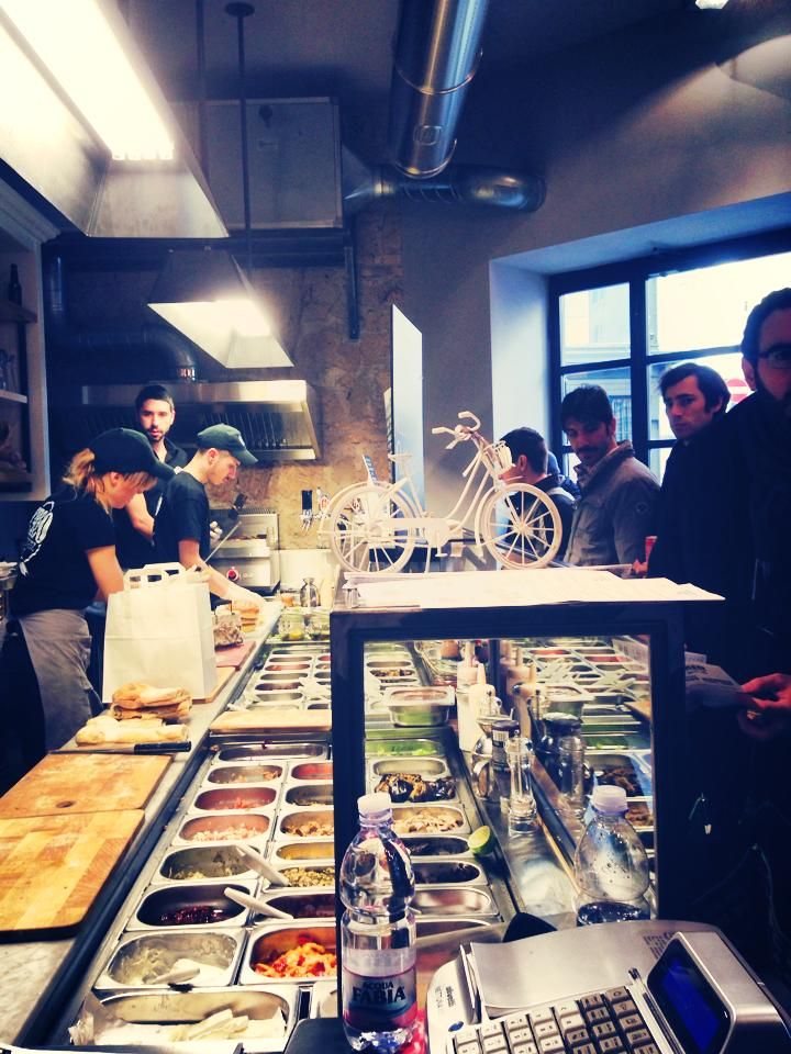 Sul vetro della porta d’ingresso c’è scritto: “Per la panificazione di tutti i nostri prodotti non si usano additivi miglioratori e grassi animali e le nostre farine sono di qualità e certificate”. E, come racconta a un cliente un ragazzone alto che dice di essere il proprietario, i panini hanno una sfoglia particolarmente leggera da digerire. L'omone, a una mia domanda, sull'uso o meno del lievito madre risponde in maniera piuttosto vaga: “So soltanto che Albanesi, storico panificio vicino via Marconi, prepara questo pane appositamente per noi…”. E lascia intendere che un po’ di preparazione in più, da parte del personale, non guasterebbe a un locale che tenta di sembrare al quanto sofisticato.