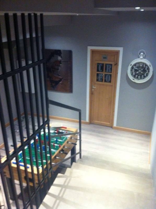 Le pareti sono tinte di grigio e contornate di bianco o in alternativa fatte di mattoncini. Il legno è utilizzato per le porte, ma anche per le sedie (e gli sgabelloni), altrimenti sostituito dall’alluminio. Ornamenti immancabili (come in altri finti vintage) sono il biliardino, le lavagne-menu e i tubi a vista, che sanno di factory dismessa.