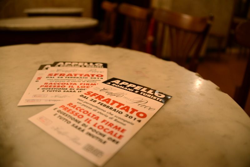 Ma a via della Pace è un via vai di persone che portano alla signora Daniela e ai suoi 30 collaboratori attestati di stima e di solidarietà. Dalle 11 alle 13 si può trovare proprio lei, la storica proprietaria, dietro il bancone pronta ad offrire ai clienti, ai visitatori e ai sostenitori che vorranno firmare l'appello un flut di prosecco e qualcosa da mangiare. Di firme al momento se ne contano 5mila. L'obiettivo è di arrivare a 50mila, per poi presentarle al sindaco Marino. Prima che lo sfratto diventi esecutivo e Roma perda un altro pezzo della sua storia.