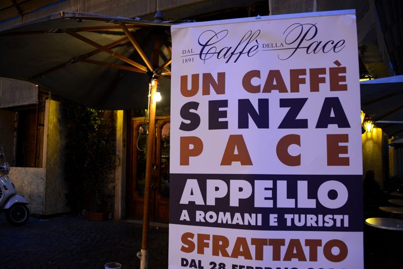 E' una corsa contro il tempo. Da un momento all'altro la famiglia Serafini, che gestisce il Caffè della Pace da oltre 40 anni, potrebbe vedere arrivare gli ufficiali giudiziari pronti a far sgomberare i locali. Nonostante rientri nell'albo delle botteghe storiche, infatti, la proprietà, l'Istituto Teutonico Pontificio di Santa Maria dell’Anima, vorrebbe far nascere nello stabile un albergo. Un hotel, quindi, dove Ungaretti o Monicelli amavano sostare. Un andirivieni di trolley al posto dei tavolini risalenti al 1891.