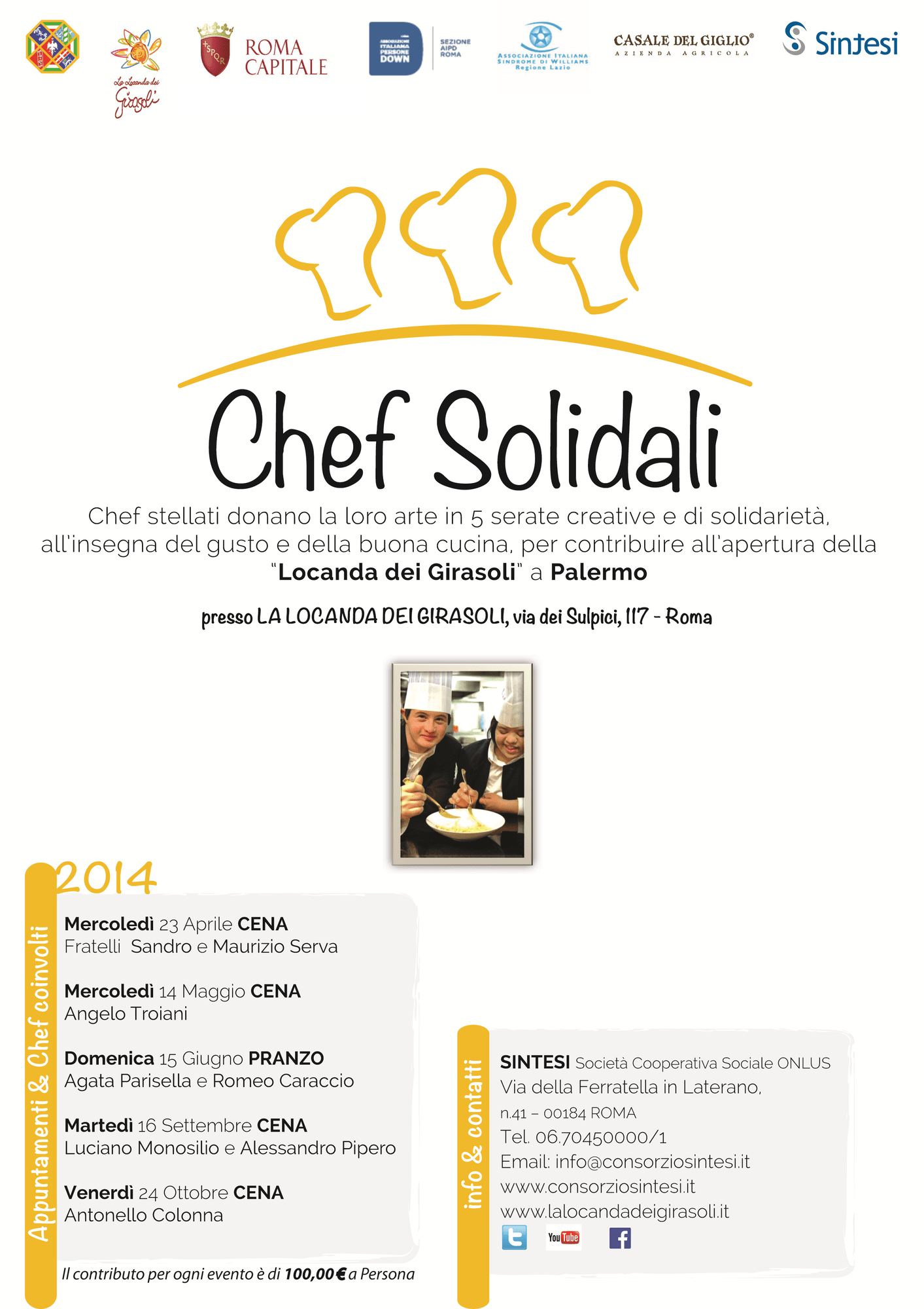 Otto chef stellati (e solidali) per la Locanda dei Girasoli. Una maratona di solidarietà e di arte culinaria nella cucina del ristorante romano che per quattro cene e un pranzo sarà il regno di Sandro e Maurizio Serva (del ristorante La Trota di Rivodutri, provincia di Rieti), Angelo Troiani (Il Convivio Troiani), Agata Parisella e Romeo Caraccio (Agata e Romeo), Luciano Monosilio e Alessandro Pipero (Pipero al Rex), Antonello Colonna (Open Colonna), che contribuiranno con il loro tocco da chef a dare vita a una nuova Locanda dei Girasoli, questa volta a Palermo.