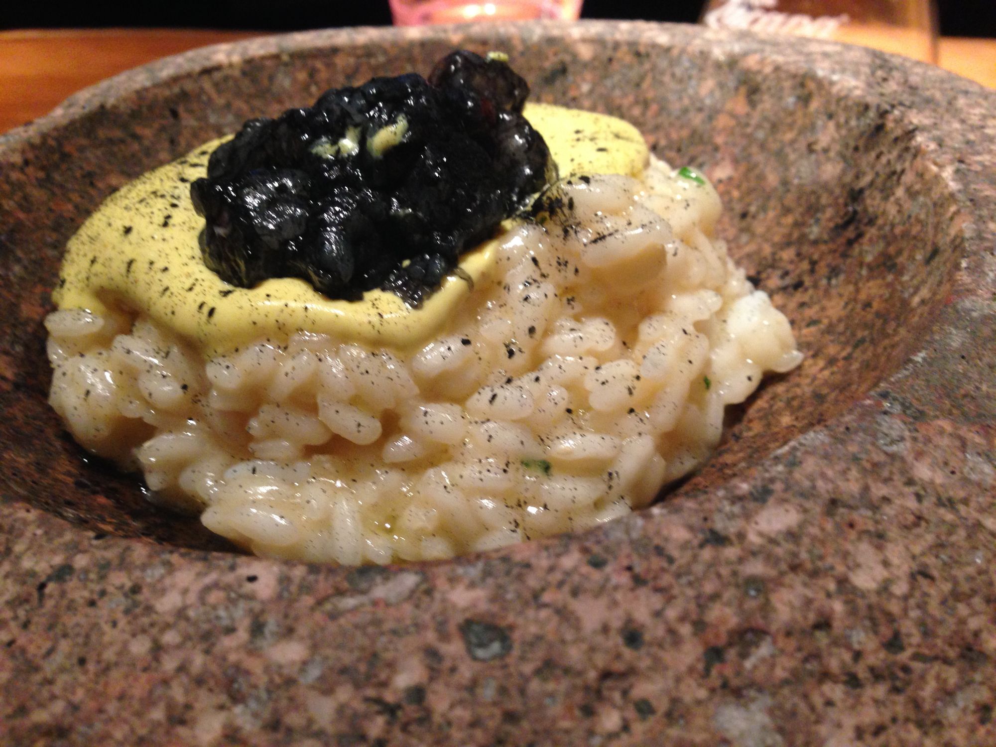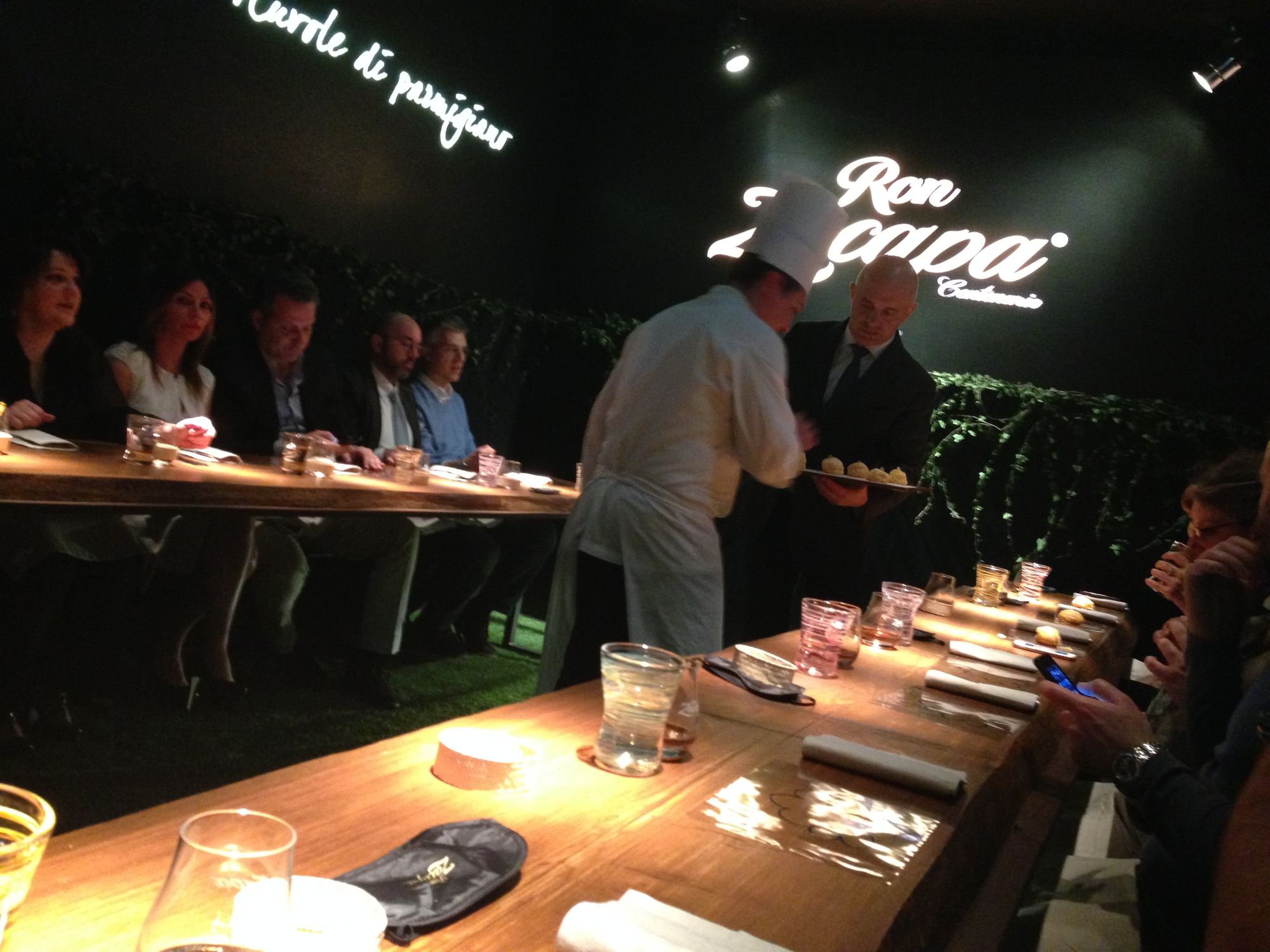 Esperienze raffinate ed estreme, nelle quali lo chef si è impegnato (con ottimi risultati) per declinare la sua cucina in cene da degustare con il rum. Quello che vedete è un risotto di acqua di pesce mantecato al fumo e pepe di Sichuan verde (da scavare nella pietra), bergamotto e crudo di gamberi e scampi al carbone.