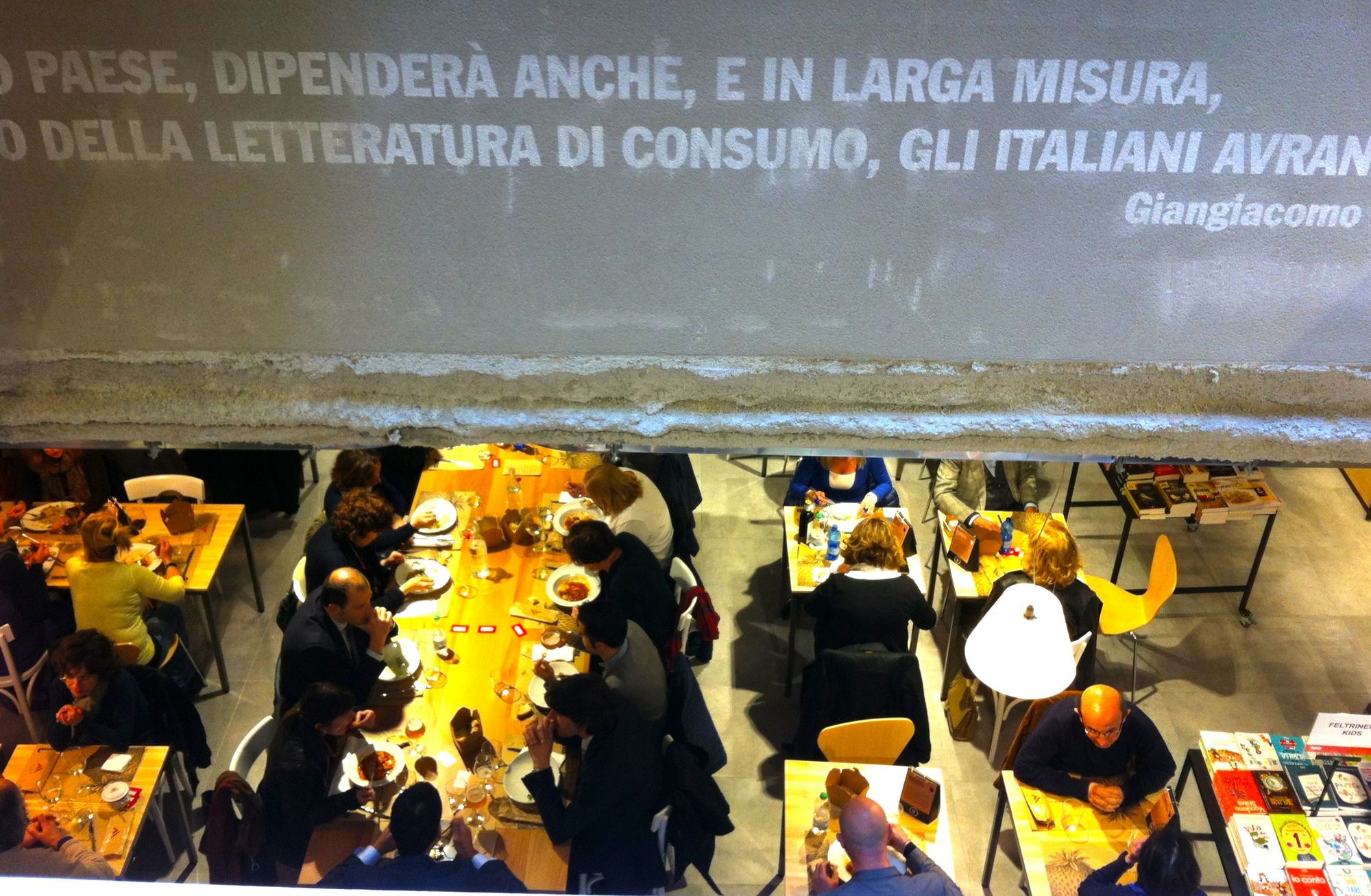 A giudicare dall'inaugurazione, martedì scorso, la città sembra aver accolto di buon grado la novità: la serata si è risolta in un bagno di folla, decisamente troppa per apprezzare il luogo. Abbiamo deciso di tornare l'indomani, per pranzo, trovando il negozio ancora molto affollato e un bel po' di coda da fare prima di ottenere un tavolo libero. L'attesa, in ogni caso, passa presto: il ristorante, al piano terra, fa parte a tutti gli effetti della libreria, con i tavoli allestiti tra gli scaffali, e mentre si aspetta si può sfogliare un saggio sulla prima guerra mondiale pescato da un'apposita sezione o, per restare in tema, l'ultima fatica di Jamie Oliver.