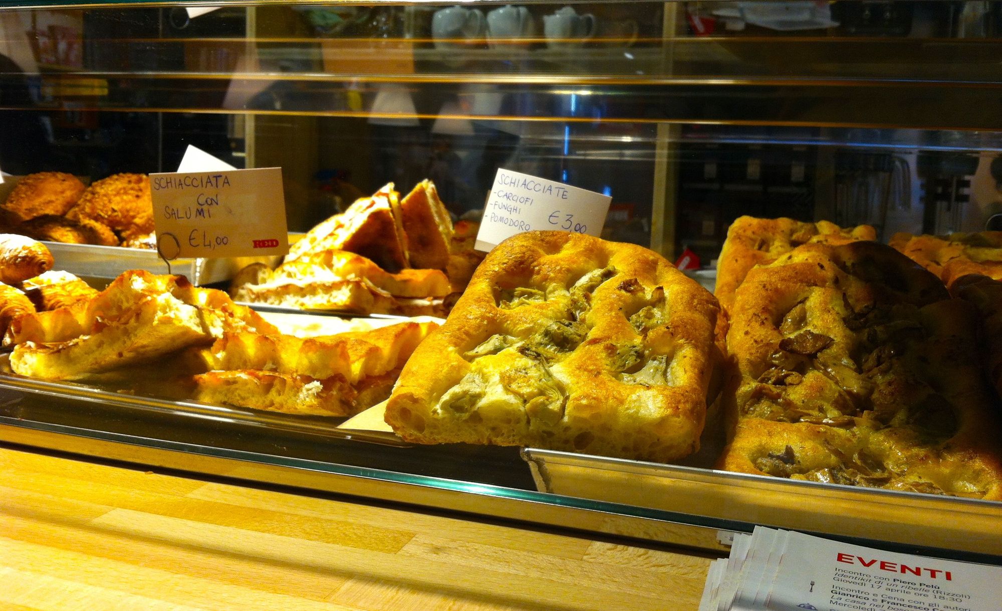 Prima di uscire diamo un'occhiata al bancone, dove ci si può sedere per un caffè o per consumare uno spuntino: esposti ci sono muffin e focacce dall'ottimo aspetto e, tra le alternative, c'è anche il classico panino al lampredotto, al prezzo di 4 euro. E proprio al re del cibo da strada fiorentino scopriamo che sarà dedicato uno dei primi incontri ospitati dalla libreria, il prossimo 13 maggio alle 18.30: protagonista Leonardo Torrini, lo storico trippaio di Gavinana.