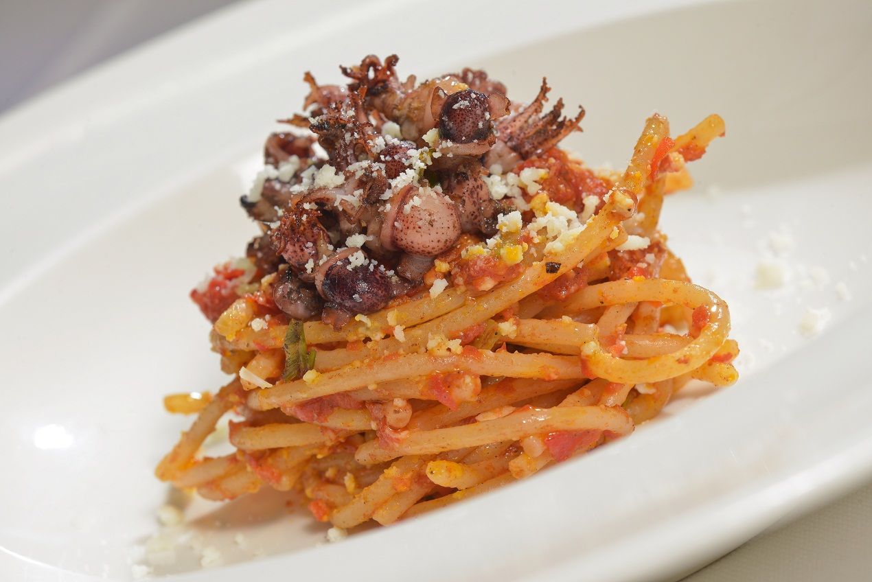 Un piatto classico romano (ma rivisitato per l'occasione) da Angelo Troiani: "L’Amaretriciana" per Romanesco 2014. Menu della cena: prosciutto di palamito con fichi freschi e pizza bianca; maccarello, misticanza "ajo e ojo", melone e ratafia; fiore di zucca ripieno di ricotta romana Dop, pesche, menta, talli d’aglio, panzanella ai funghi porcini; tagliolino ai gamberi bianchi, pecorino e menta; amaretriciana; carrè d’agnello in 3 preparazioni; sorbetto di finocchio selvatico, spuma cioccolato bianco, olive nere e arancia.