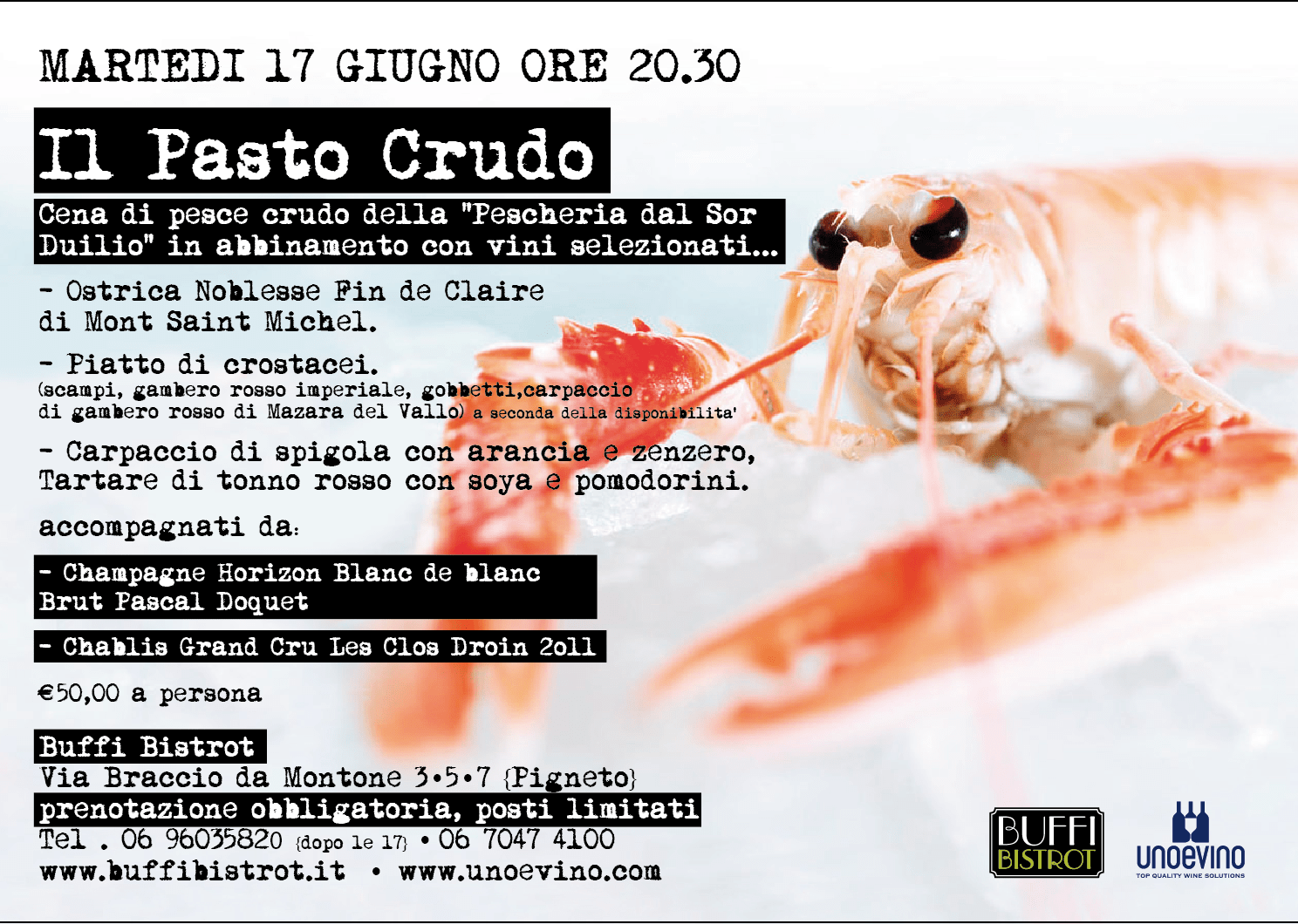 Il pesce crudo è quella della rinomata Pescheria del Sor Duilio. I vini sono quelli selezionati dall'enoteca Unoevino. Il risultato di questo abbinamento? La cena "Il Pasto Crudo" da Buffi Bistrot, al Pigneto. Ostriche, crostacei e carpaccio di spigola, abbinati a Champagne e Chablis Grand Cru.