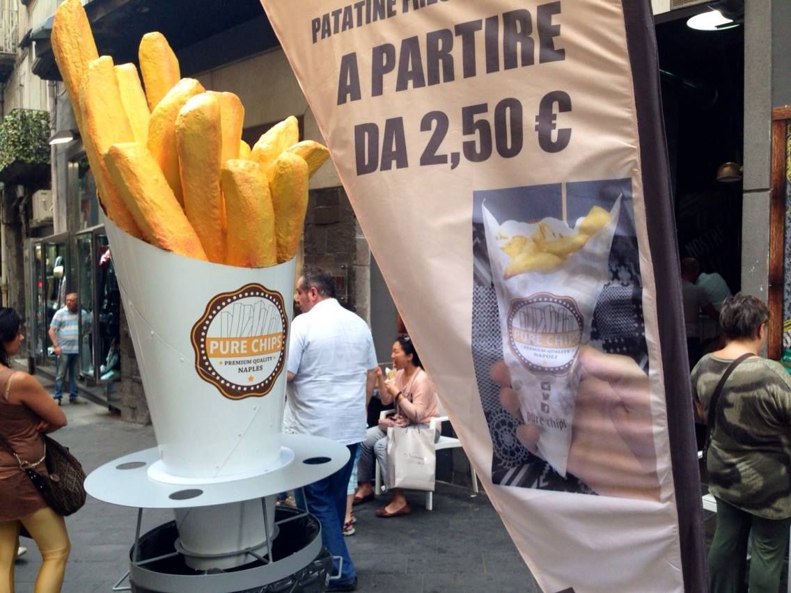Vip qui significa very important potatoes. Patate importanti servite a gente importante: gli ospiti di Alfredo Colella, padrone di casa e imprenditore degli storici marchi d'abbigliamento partenopeo Cioccolata e Pure Jeans (di qui il nome dell'attività). Il suo locale di via Chiaia è frequentato da gente famosa e per accorgersene basta dare uno sguardo alla pagina Facebook: c'è Edinson Cavani, c'è Enzo Gragnaniello, c'è Tullio De Piscopo e tutte le celebrità che riesce a invitare e taggare (attingendo anche da vecchie foto). Le porzioni disponibili sono tre: little (2,50 euro), medium (3,50 euro) e large (5 euro). Lascia spaesati il commento di Colella su Facebook a un amico che gli chiede come aprire un nuovo Pure Chips. "Devi chiamare Chipstar", scrive. Il mistero della patatina si infittisce.