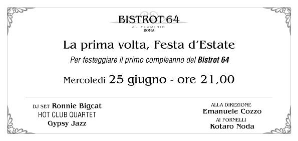 Il primo compleanno di Bistrot64 si celebra con Festa d'Estate. Con Kotaro Noda ai fornelli ed Emanuele Cozzo alla direzione. Dj set Ronnie Bigcat. Hot Club Quartet – Gipsy Jazz.