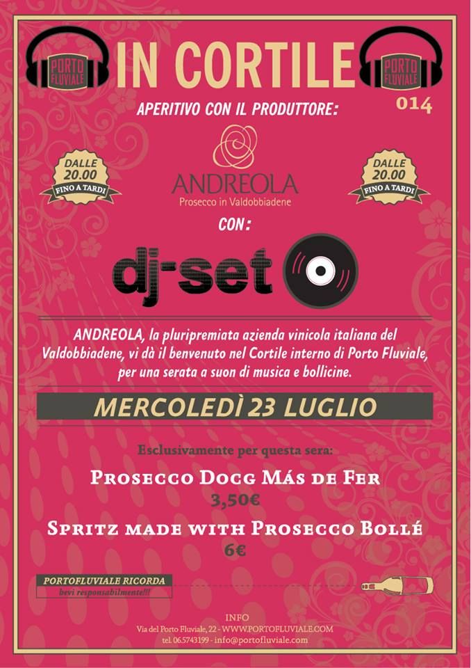 Serata di musica e degustazioni nel cortile del Porto Fluviale. Per l'appuntamento "Aperitivo con il produttore", la cantina Andreola prosecco in Valdobbiadene.