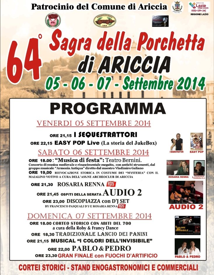 Le sagre dedicate alla porchetta si svolgono in tutta l'Italia centrale. Quella di Ariccia, giunta alle sua 64esima edizione, vi assicurerà come da programma non solo cibo, ma anche musica, spettacoli da vivo, rievocazioni storiche ed eventi culturali (segnaliamo solo la rievocazione storica dei “Mysteria” con figuranti in costume romano che ricostruiranno la processione votiva in onore di Cerere con le offerte di cereali, pane, vino e una serie di maialini votivi; e le visite guidate in occasionbe del bimillenario della morte di Augusto).