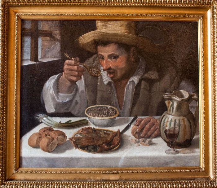 Per chi non lo sapesse, facciamo un ripasso di storia dell’arte: Annibale Carracci è un pittore italiano del 500, noto per aver decorato il piano nobile di palazzo Farnese, ma anche autore, e qui casca a fagiolo, di un bellissimo ritratto di un uomo in osteria, intitolato “Il mangiafagioli” (1853).