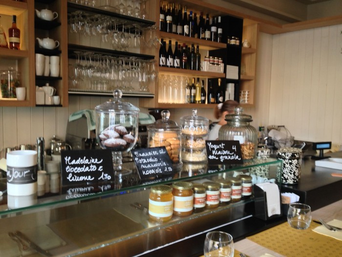 Al bancone, marmellate, conserve, vasi colmi di biscotti e piccola pasticceria.