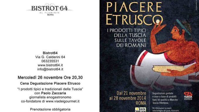 Bistrot64 con lo chef Kotaro Noda propone una cena dedicata ai prodotti tipici della Tuscia viterbese. Nel menu: antipasto: uovo 64°C, crema di fagioli del Purgatorio, Mazzafegato e caldearroste; primo: tortelli di coniglio in brodo di anguilla affumicata; secondo: filetto di manzo marinato al farro fermentato con carote di Viterbo e carciofi; dolce: nocciole, ricotta ed E.V.O. Fagioli, castagne, coniglio, carote, carciofi, nocciole, ricotta e olio extravergine di oliva. Questi gli ingredienti che provengono dalle aziende agricole partecipanti all'iniziativa della Camera di Commercio di Viterbo e che verranno utilizzati per il particolare menu. Una serata commentata dal giornalista Paolo Zaccaria. Prenotazione obbligatoria.