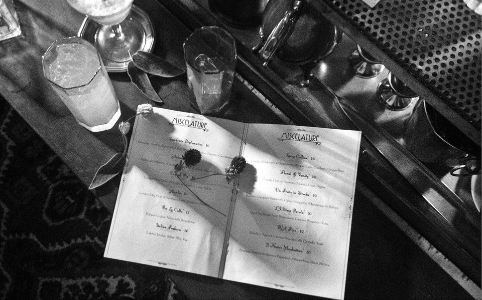 Niente vino, niente birra, niente cibo. Sul banco degli imputati ci sono whisky, tequila, rum e gin, ma soprattutto le dodici miscelature creative (tutte a 10 euro, tranne una, Por la Calle, che costa 12). C’è l’Amalia – London Dry, fiori di sambuco, lime, zucchero e zenzero – e Floral & Vanity – Tequila, fiori di sambuco, violetta, lime e agave, e poi i più estrosi Autumn Soue – Vodka al gelsomino, mandarino, limone, zucchero e bianco d’uovo, o English Pie – London Dry, cacao, sciroppo ai lamponi, lime e salvia. Ogni cocktail esige il suo tempo d’esecuzione e un meticoloso rituale.