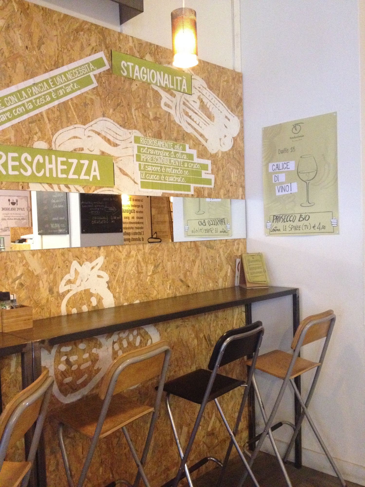 Un pasto veloce o anche da portare via? Da Radicetonda l’ambiente è smart, così come la cucina: dal bancone in materiali riciclati si può scegliere come comporre il proprio piatto misto vegano scegliendo tra pasta al forno, verdure gratinate e altre proposte tutte biologiche e sfiziose, oppure si può optare per il veg burger a base di cereali e legumi con maionese e ketchup vegetali. La parte sinistra del bancone è tutta dedicata alle torte di frutta e farina integrale. A caratterizzare questa piccola tavola calda è anche l’attenzione per l’ambiente: piatti, forchette e bicchieri sono tutti biodegradabili, così come il packaging per il takeaway. D’obbligo la centrifuga con mela, carota, zenzero e sedano.