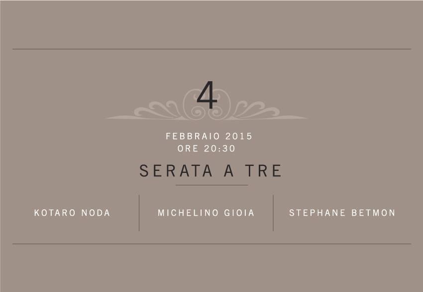 Serata a tre da Bistrot 64 con Kotaro Noda, Michelino Gioia, Stephane Betmon. Nel menu: antipasti: spaghetti di patate al burro, alici e ricci di mare; capesanta, galletta croccante, patata affumicata e salsa di mele; primi: ravioli di sedano rapa in consomme’ di granciporro, fregola sarda, astice, carciofi e polvere di caffe’; secondi: roll di cinghiale e lardo con crema al tartufo, piccione, crema di foie gras, scalogno fondente e indivia belga. Dolce: ananas vittoria arrosto al passion fruit, spezie e gelato allo zenzero candito.
