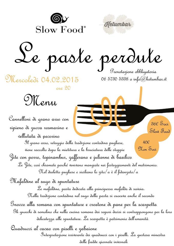 Dai quadrucci con piselli agli ziti napoletani, seguendo il gusto di una volta: "Le paste perdute" è la cena che Ketumbar organizza con Slow Food Roma.