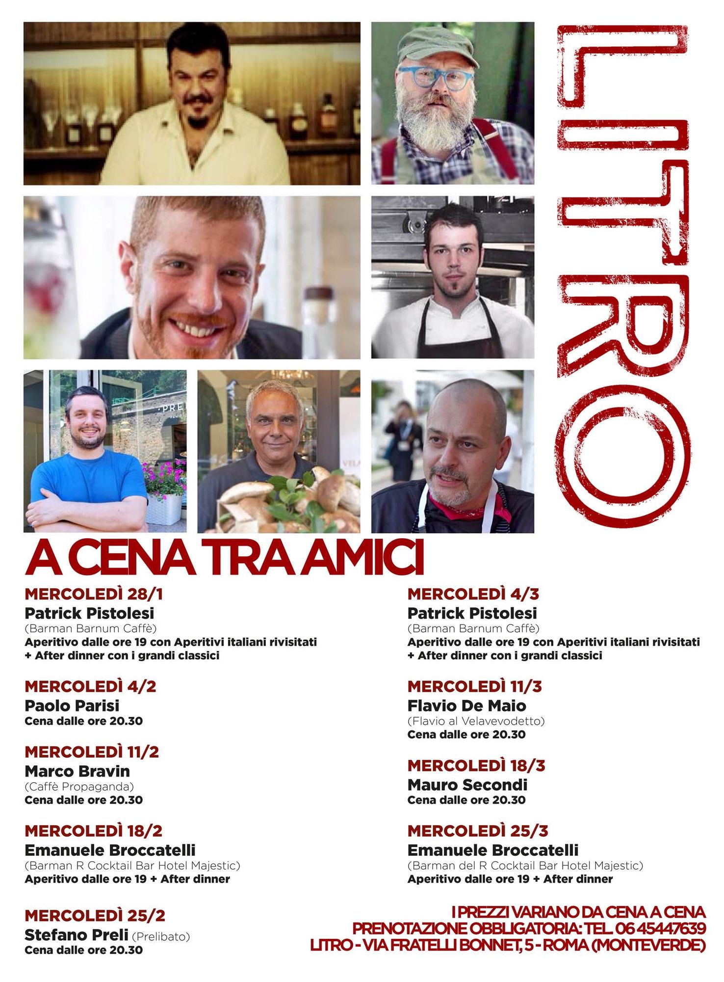 Litro a Roma, ogni mercoledì sera "a cena tra amici" con i migliori chef e bartender. Torna nel 2015 il ciclo di appuntamenti culinari che hanno caratterizzato la vineria di Monteverde vecchio a Roma. Ogni settimana, partenza 28 gennaio e fino al 25 marzo, saranno le firme della ristorazione e dei cocktail ad alternarsi ai fornelli o al bancone di Pino Mondello.