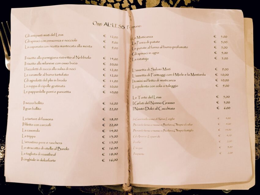 E poi c’è il bollito, piatto forte de Al’Less (ça va sans dire), che la testata Marco Polo annovera tra i 20 migliori bolliti d’Italia. A scelta la porzione: il gran o il mezzo.