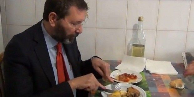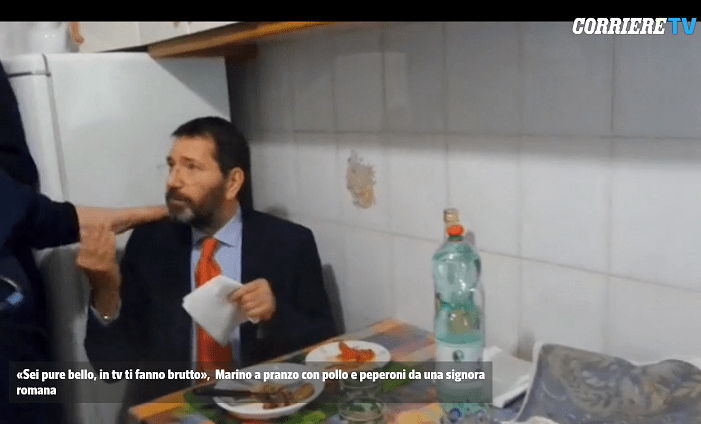 Marino a pranzo a Torpignattara a casa di una signora romana. "Non è politica, è pajata", come recita lo slogan di Coatti per Marino. Anzi, in questo caso è un pollo con i peperoni quello che Ignazio Marino si è concesso ieri a Torpignattara. Il sindaco-chirurgo ha abbandonato per un giorno la sua dieta salutare per la specialità della signora Azara, che lo ha invitato a pranzo ieri mattina durante la riapertura di via Filarete. Nel video del pranzo di famiglia, già tormentone sul web, Marino gusta l'ipercalorico piatto mentre la signora non gli risparmia complimenti: "Sei pure bello, in tv ti fanno brutto".