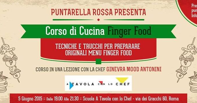 Corso di cucina finger food Roma, giugno 2015 Dopo il lancio del corso di cucina senza glutine e cucina americana, Puntarella Rossa si dedica a piatti realizzati appositamente per leccarsi le dita proponendovi un simpatico corso di cucina finger food. Un corso in una lezione, il 5 giugno 2015, aperto a tutti, per apprendere tecniche e trucchi per preparare un originale menu finger food per stupire amici e parenti anche all’ultimo minuto con gli ingredienti che puoi avere in casa o trovare facilmente.