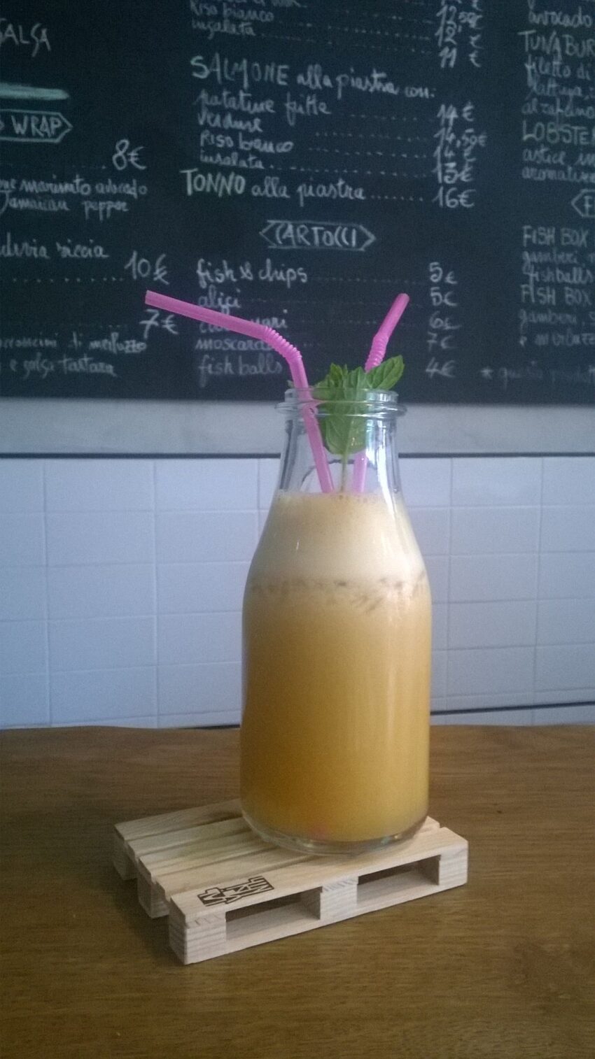 Da bere ci sono centrifughe fresche, energetiche e rilassanti, a base di frutta, verdura ed erbe aromatiche, servite in mini bottiglie di vetro che ricordano quelle usate una volta per il latte (costano 3,50 euro). La “bella” stagione è arrivata, al Fish Lab la trovate servita.