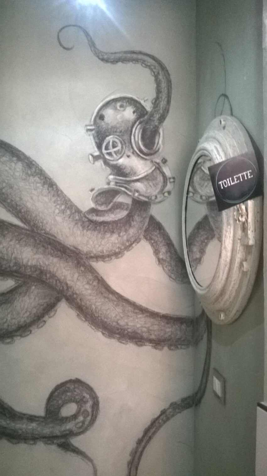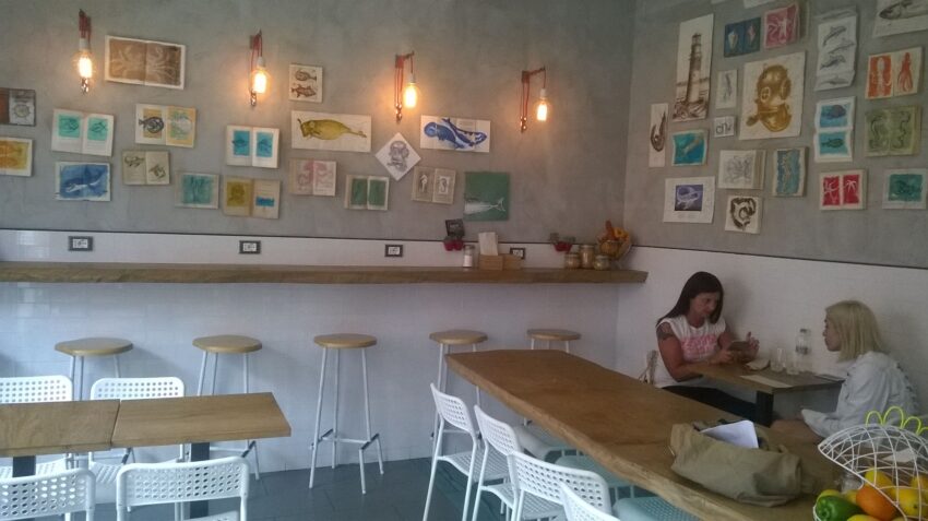 Dall’apertura del locale che vi abbiamo raccontato, a settembre 2014, ci sono state tante novità, non solo nel menu sempre sottoposto a creative evoluzioni, come impone la vocazione “lab” del locale (altre sorprese saranno presto svelate), ma anche nella sala: da qualche tempo il Fish Lab si è allargato e può offrire ai consumatori uno spazio con sedie e tavoli, dove le pareti sono arredate con originali “libri-quadro” rigorosamente a tema marino e un’ampia vetrata permette la vista su strada.