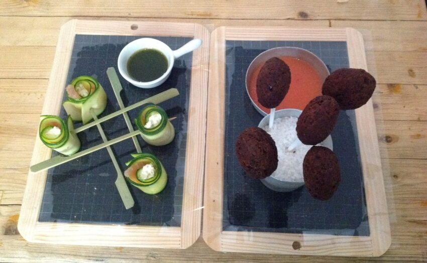 Il menu propone: spiedini di maiale, falafel, sushi taco, mini burger, sformatini e baccalà e tra i dolci merita provare le mini bombe da guarnire personalmente con la sac à poche piena di crema, il tiramisu fai il tuo, le ciabattine della buonanotte.