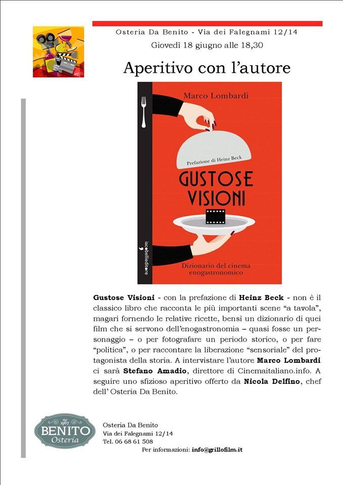 L'Osteria Da Benito ospiterà questa sera Marco Lombardi per la presentazione del suo nuovo libro 'Gustose Visioni', dizionario del cinema enogastronomico, con prefazione di Heinz Beck. Seguirà aperitivo offerto dallo chef Nicola Delfino.