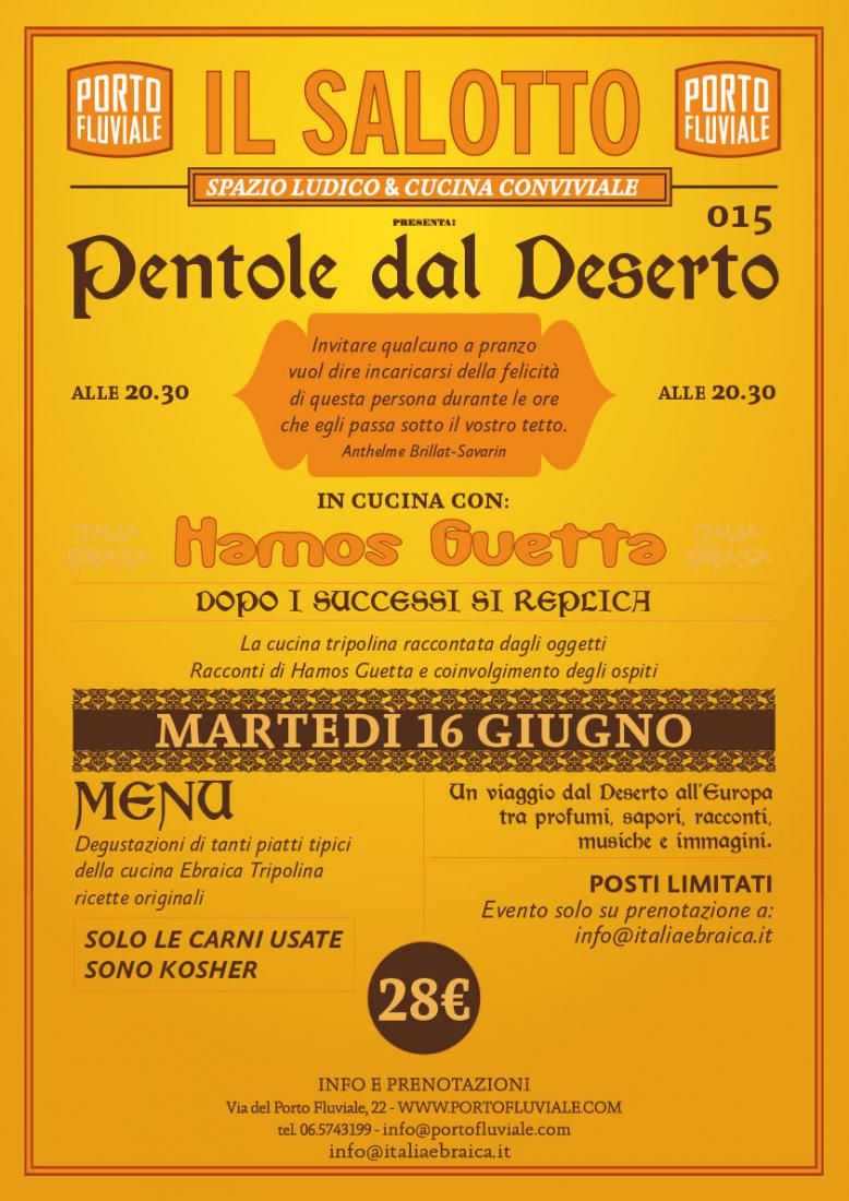 Il padrone di casa per questa sera al Porto Fluviale è Hamos Guetta, colui che può riuscire a farvi assaporare realmente la cucina ed i sapori speziati del medio Oriente. Lasciatevi trasportare dai profumi e dai racconti della storia ebraico-tripolina, in una serata accattivante ed originale.