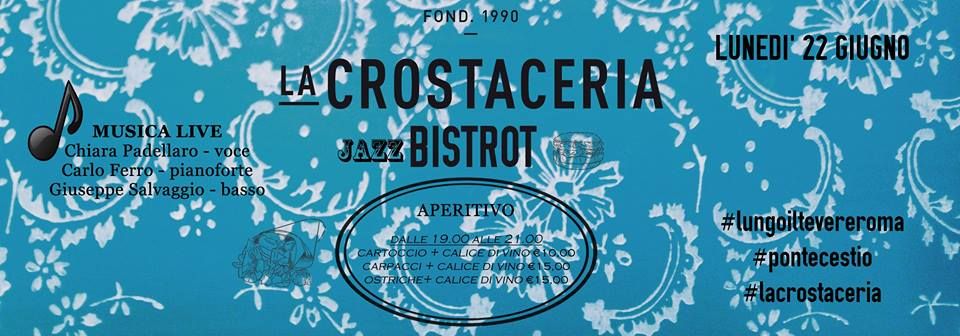 Stessa formula ma nuova location per La Crostaceria che porta sulle sponde del fiume Tevere la serata Jazz Bistrot. Nel menu troverete antipasti a base di cartoccio di calamari, arancini di mare, tempura di gamberi, gustose polpette espresse, burger di pesce, tartare e insalate. Non mancheranno le tradizioni e i sapori della Sicilia con i "Sicily Gourmet". E poi la musica, questo lunedì con il jazz raffinato di Chiara Padellaro – voce, Carlo Ferro – pianoforte, Giuseppe Salvaggio – basso. Per l'arte, attualmente è in corso a Monti l'esposizione di Susanna Proietti che in occasione di questo lunedì sul Tevere porterà alcuni sui quadri. Per i drink, oltre alle birre alla spina e alla carta dei vini, il barman Vincenzo Palermo che ha creato appositamente per la location sul Tevere una nuova carta di cocktail.