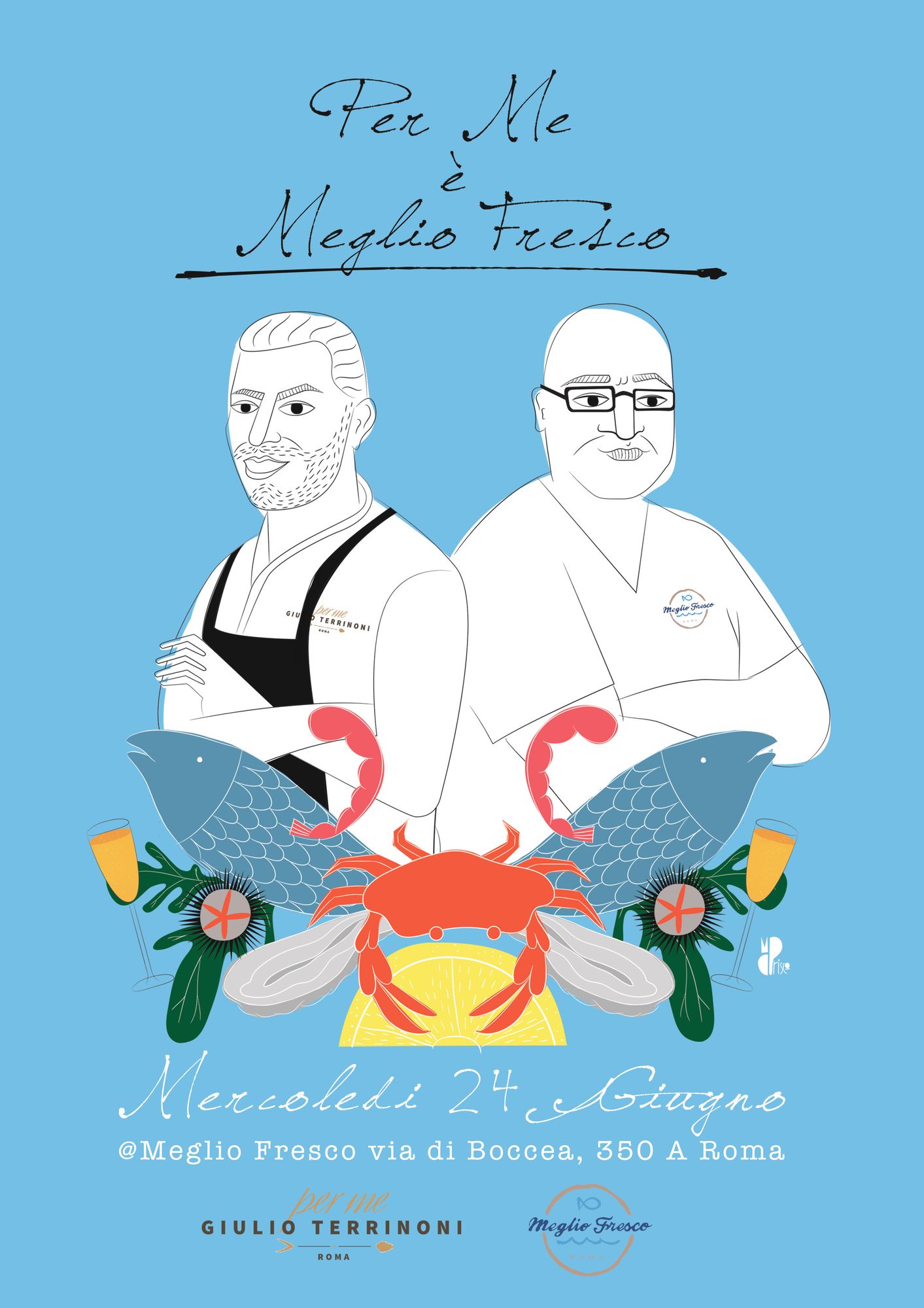 Prima Tappa del "Tour Inaugurazione Per Me – Giulio Terrinoni 2015": le ricercatezze ittiche selezionate da Arturo Scarci incontrano l'alta cucina istintiva di Giulio Terrinoni in una serata di puro virtuosismo gastronomico. Nella storica pescheria Meglio Fresco, del "poeta di mare" Arturo Scarci, lo chef stellato GiulioTerrinoni (che a breve inaugurerà il suo nuovo locale Per Me, in vicolo del Malpasso a Roma), propone una cena informale di qualità, a base di eccellenze ittiche scelte in giornata dal mercato del pesce. Solo 35 posti disponibili. In abbinamento (compresa nel prezzo della serata) non mancherà la selezione di vini e champagne.