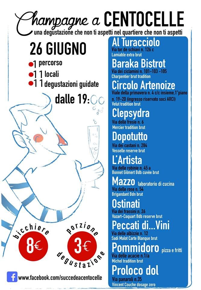 Una degustazione che non ti aspetti nel quartiere che non ti aspetti. E' così che si presenta l'iniziativa di questa sera che attraverserà l'intero quartiere periferico di Roma, coinvolgendo 11 locali, 11 Maison di Champagne, ed effettuando 11 degustazioni guidate. I locali che partecipano all'evento sono Al Turacciolo, Baraka Bistrot, Circolo Artenoize, Clepsydra, Dopotutto, L'Artista, Mazzo, Ostinati, Peccati di…Vini, Pommidoro, Proloco Dol. In orari differenti e dislocate nei vari locali, avverranno degustazioni guidate delle Maison di Champagne presentate nei diversi locali, con abbinamenti e formule particolari che potrete scoprire man mano sulla pagian facebook con l'avvicinarsi dell'evento.