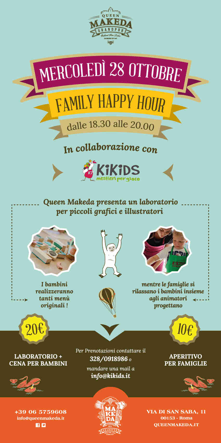 Una serata pensata per le famiglie, un momento per trovare un po’ di relax (gli adulti), divertimento (i più piccoli) e il buon cibo e il buon bere del Queen Makeda Grand Pub. E’ la Family happy hour, dove i piccoli ospiti si cimenteranno in un laboratorio di grafica per realizzare originali menu, in collaborazione con l’associazione Kikids.